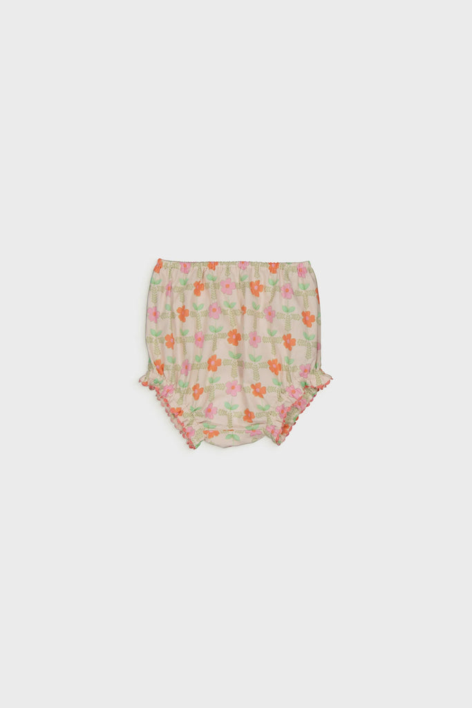 Baby bloomer in all-over printed poplin with contrasted Ric rac at the bottom. Elasticated waist and tights. Cotton Okeo-Tex Standard 100 certified...