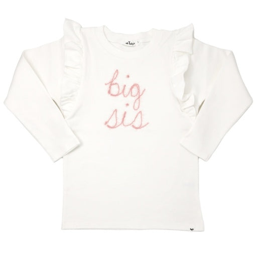 Long sleeve tee with ruffle accents.  Featuring an embroidered "big sis" applique.  Available in toddler sizes.  Designed in Minnesota. Fabric Cont...