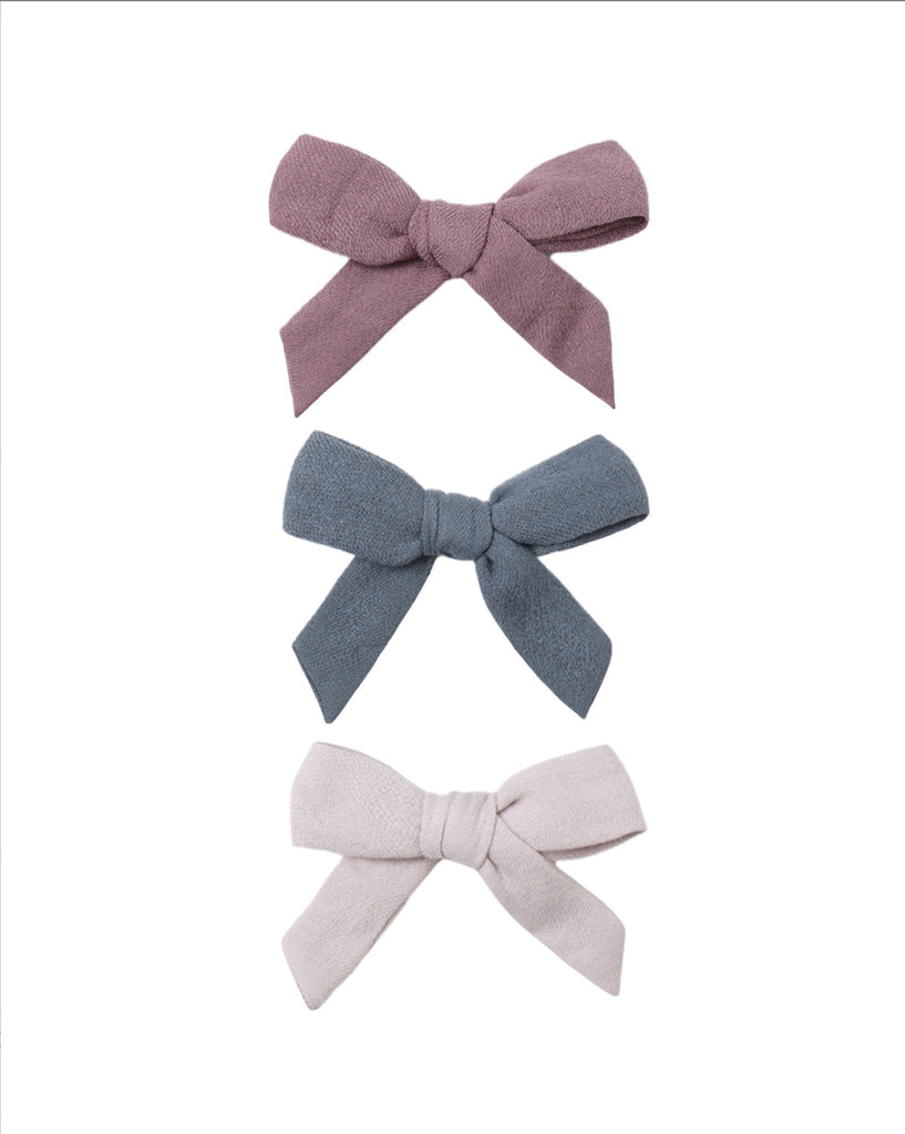 Soft cotton bow clips that are sweet, simple, and perfect for your little gals. Approximate width 3.5” Made of 100% organic cotton.