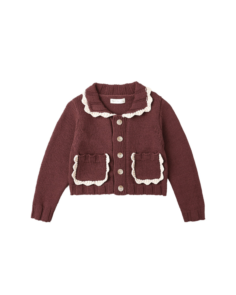 "Our Collared Cardigan features contrast crochet scallop detail on the pockets and collar for added charm and class. Featuring our 'burgundy' hue. ...