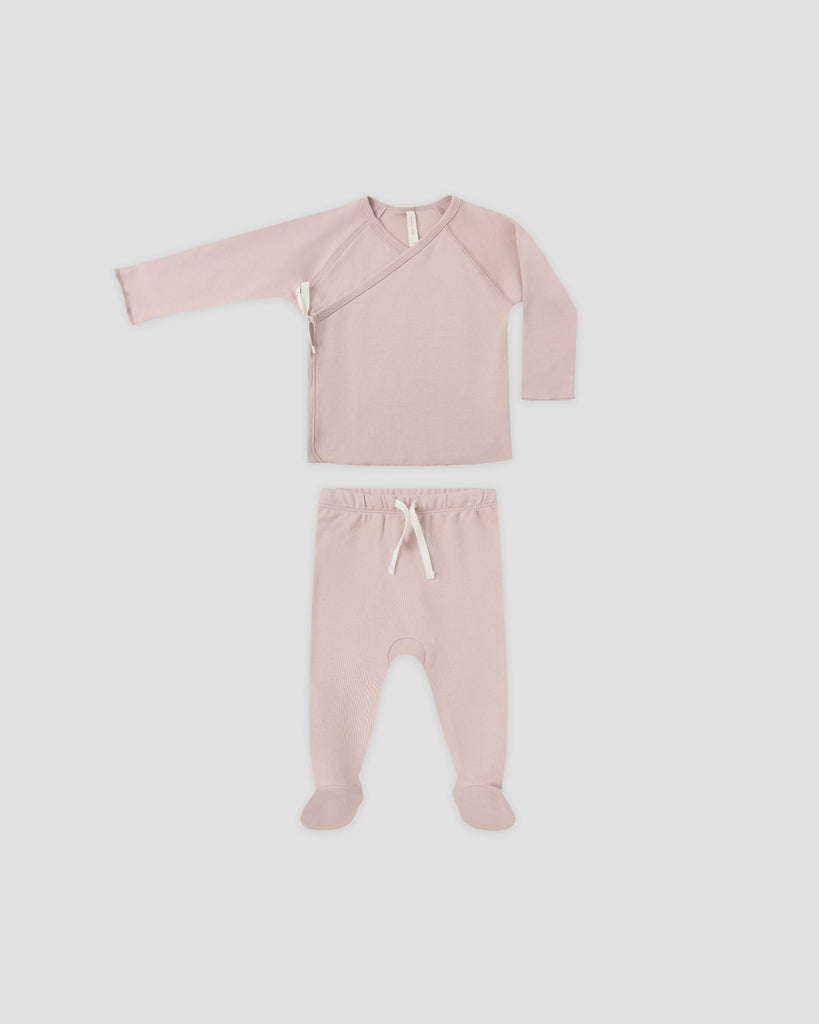 DescriptionThis sweet set features a long sleeve wrap top with a soft side-tie and hidden interior snap for easy dressing, paired with cozy footed ...