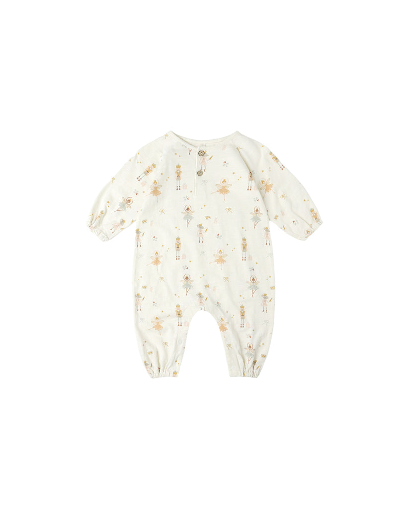 "Our Henley Jumpsuit features a bubble silhouette with elasticized wrist and ankle openings, a two-button front placket, and bottom snaps for easy ...