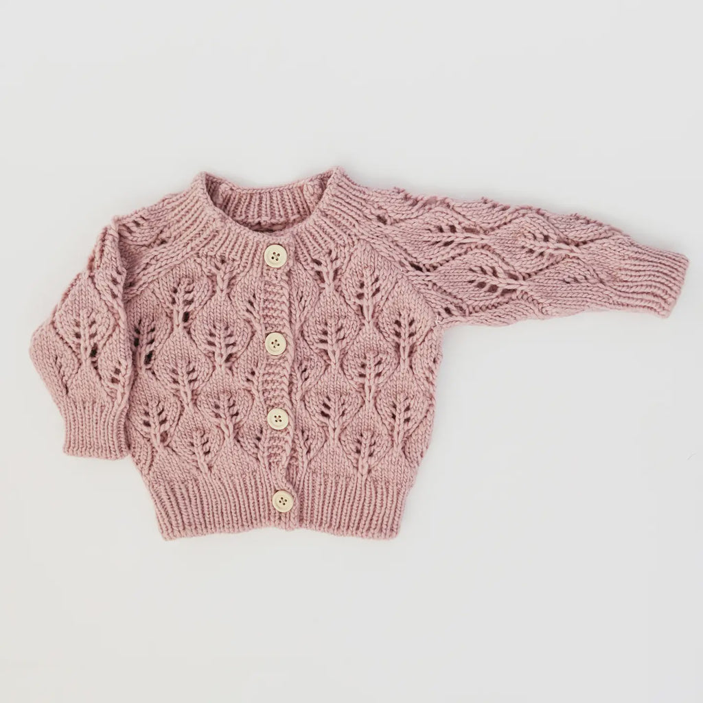 Beautiful lace knit cardigan sweater in a leaf design has raglan sleeves and buttons closed with wood buttons. Hand-knit in a pretty Rosy pink colo...