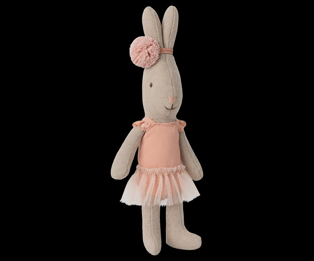 The well known Maileg micro bunny dressed up as a ballet dancer. It wears a suit and tulle skirt and has a small decoration around the pointing ear...