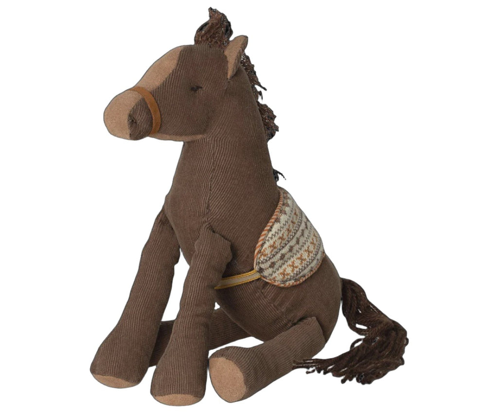 The brown pony is made of beautiful soft corduroy and has a harness on the back. Ready to start the adventure of a lifetime?