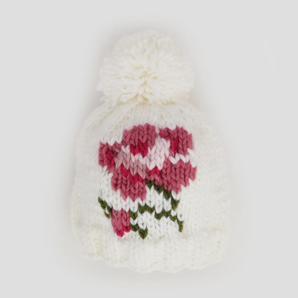 DescriptionA lovely Rose bloom is knit in shades of pink and green on a white ground. It's so soft and cozy and perfect for cooler weather.Our hats...