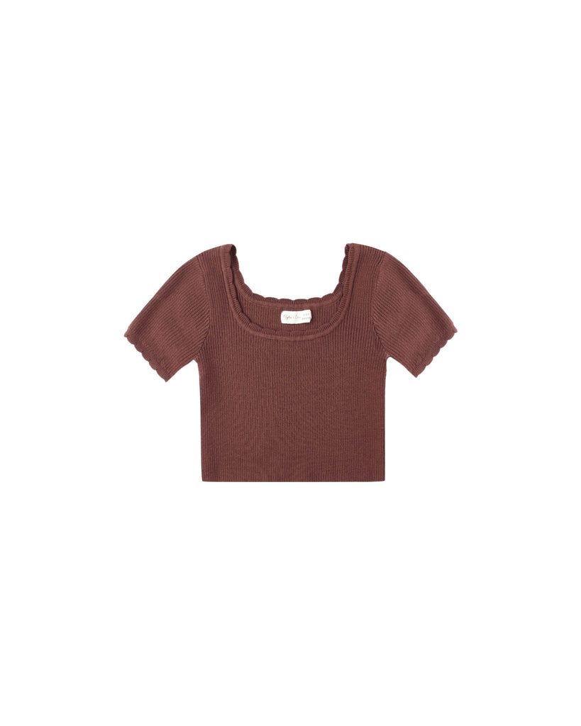 "Our cropped-fit Scalloped Tee is a versatile fall staple, crafted from delicate pointelle knit fabric and detailed with scalloped sleeves and neck...