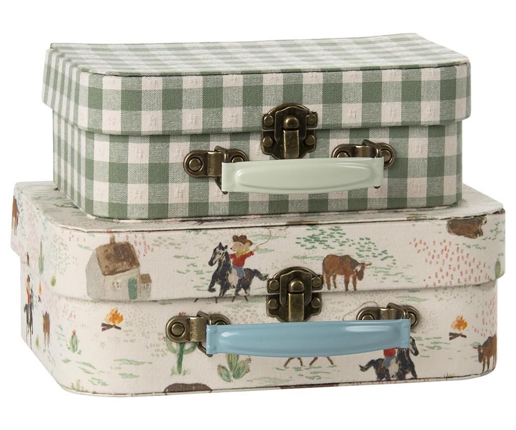 DescriptionA perfect suitcase set to store all your favorite items. Each suitcase is covered by unique Maileg fabrics and has colored metal handles...
