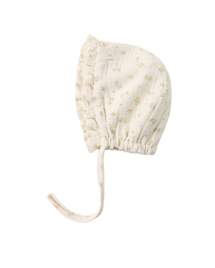 Organic cotton gauze baby bonnet with delicate ruffle trim, ties at the chin, and elastic at the back neck for a soft, secure fit. Care: Machine wa...